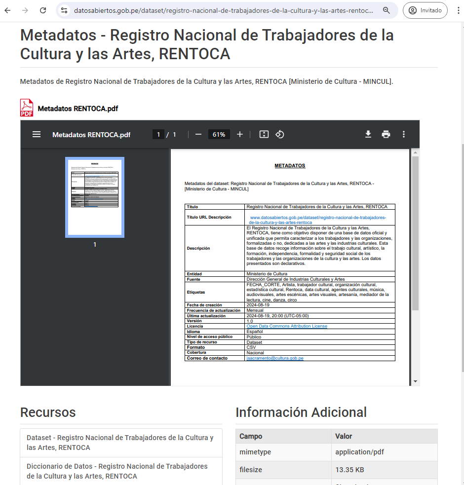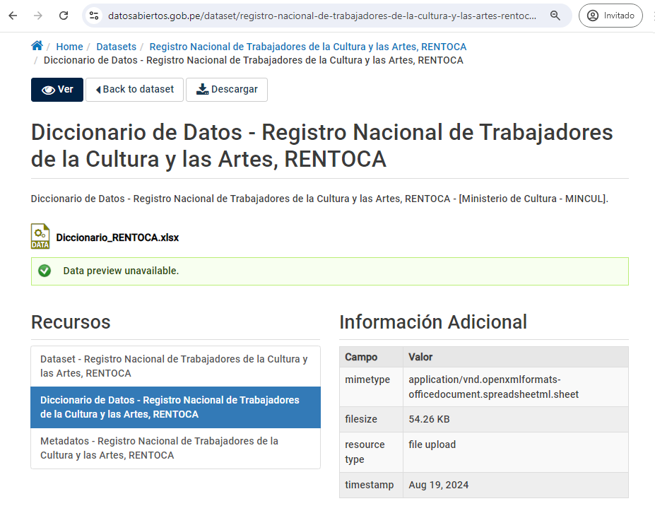 Con fecha del 20 de agosto del 2024, el Ministerio de Cultura, a través de la Plataforma Nacional de Datos Abiertos, hace públicos los datos recogidos mediante el Registro Nacional de Trabajadores de la Cultura y las Artes (RENTOCA) que se viene implementando desde el año 2022 y que, a la fecha, . De este modo, se pone disposición de la ciudadanía la información registrada de más de 30 mil trabajadores y organizaciones de la cultura y las artes sobre el trabajo cultural, artístico, la formación, independencia, formalidad y seguridad social.