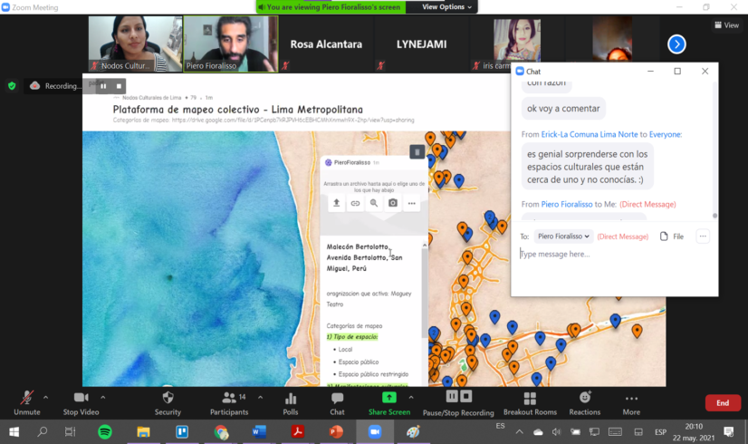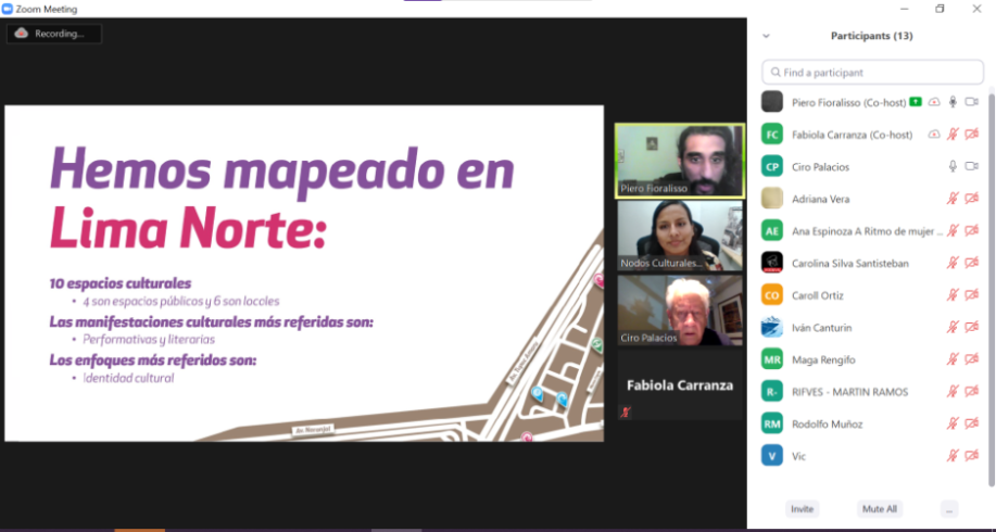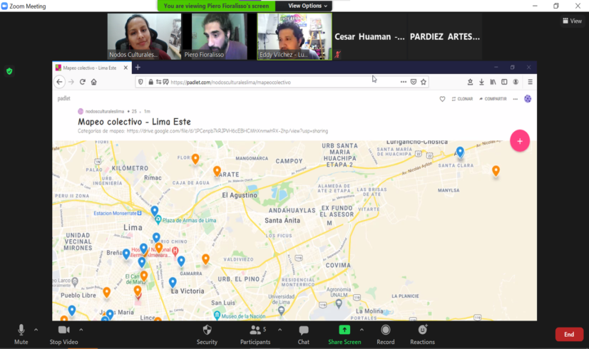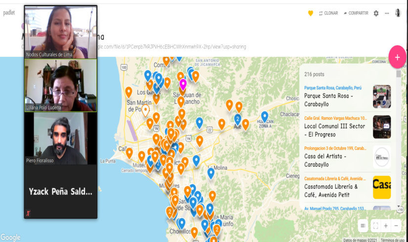 Para Lima Metropolitana, realizamos dos grandes ciclos de mapeo colectivo con sesiones abiertas y de participación libre: el primero con gestores y organizaciones culturales; y el segundo con público en general. En total realizamos 15 sesiones de mapeo colectivo donde partiriparon más de 130 personas. Debido a la crisis sanitaria, las sesiones se realizaron de manera virtual vía las plataformas Zoom y Padlet.L